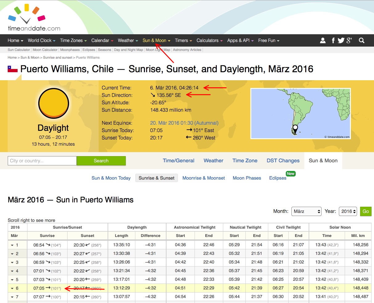 Abbildung 1: Sonnenauf- und untergänge für Puerto Williams bei timeanddate.com